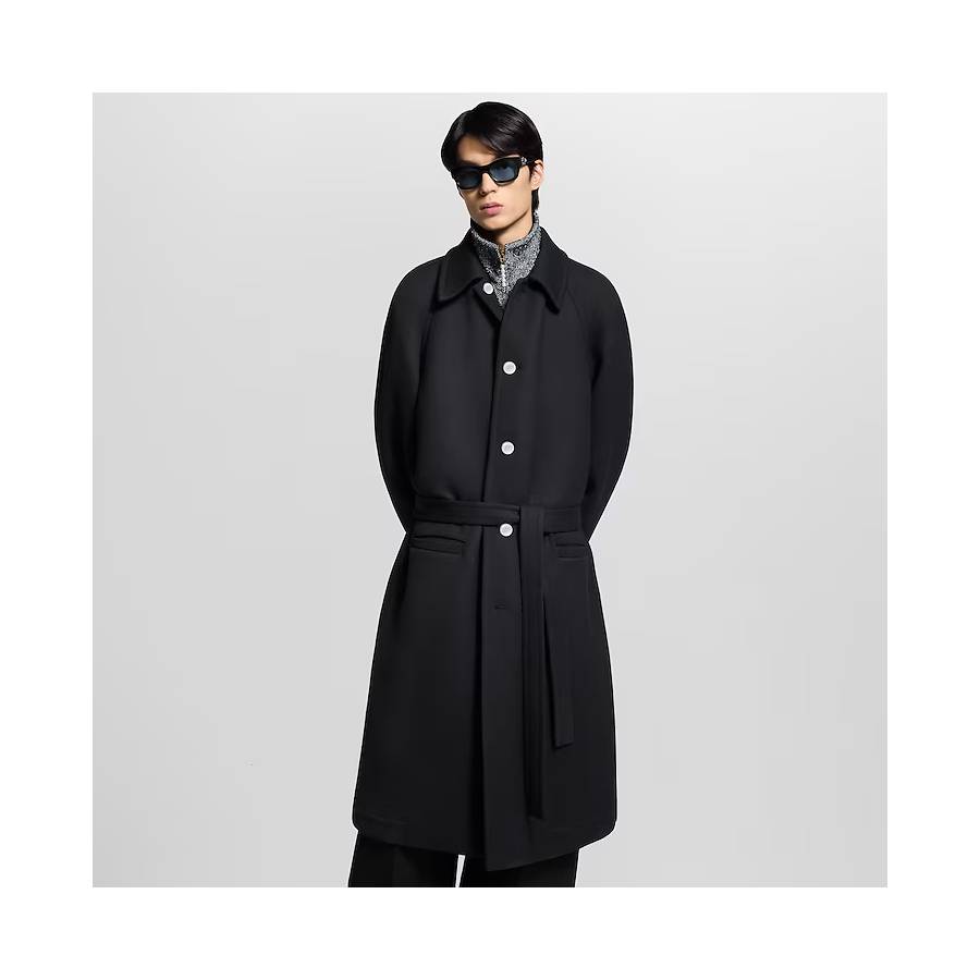 This single-breasted black coat is softly constructed in a double-face wool blend with an oversized silhouette. Mother-of-pearl effect buttons fasten up to the pointed collar, while a rear belt completes this elegant and timeless silhouette. Inside, the back is lined with a colorful silk panel adorned with a sakura cherry blossom landscape print in a nod to this season’s collaboration with Nigo.