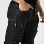 For your outfit we recommend these denim 5 pocket pants with precious elements.