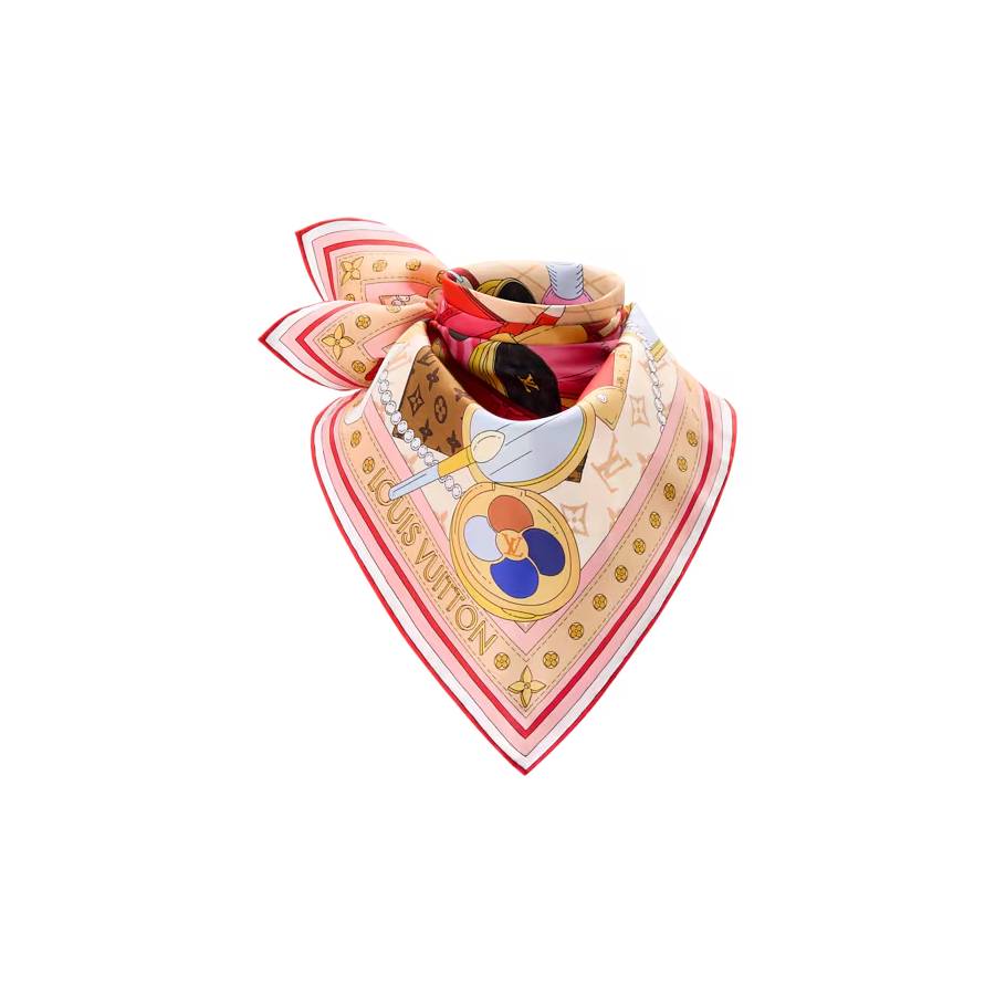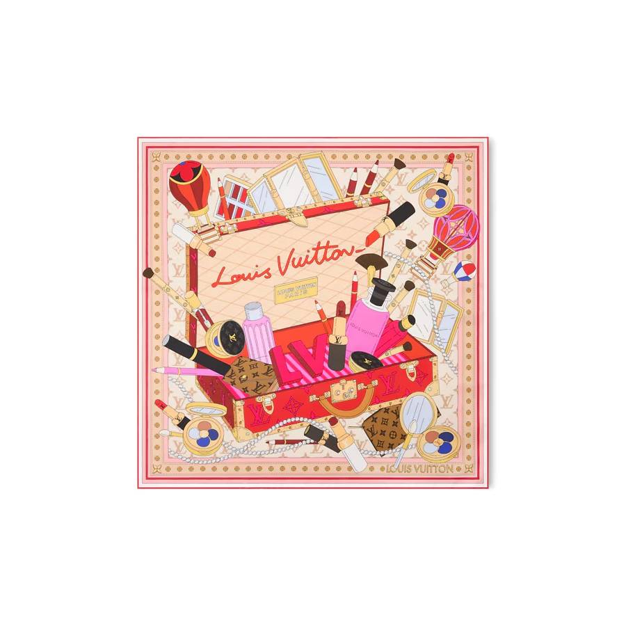 The strikingly elegant Paris En Beauté square features a colorful design mixing House emblems with glamorous feminine details. A Louis Vuitton trunk brimming with beauty accessories like lipsticks and makeup brushes is combined with hot air balloons evoking the world of travel. Subtle Monogram motifs add an extra signature touch to this iconic all-silk square.