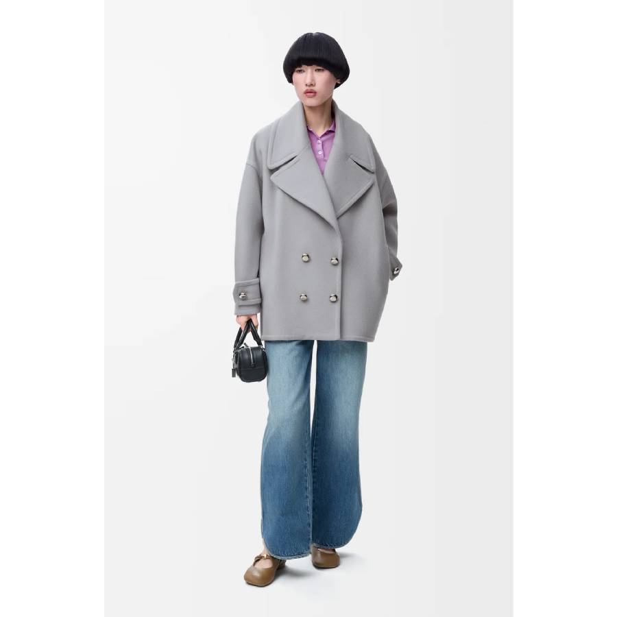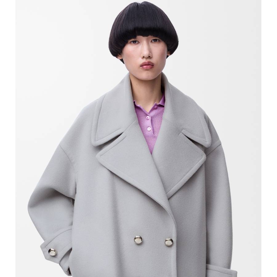 Peacoat in medium-weight double face wool featuring a double-breasted construction and a cocoon silhouette.