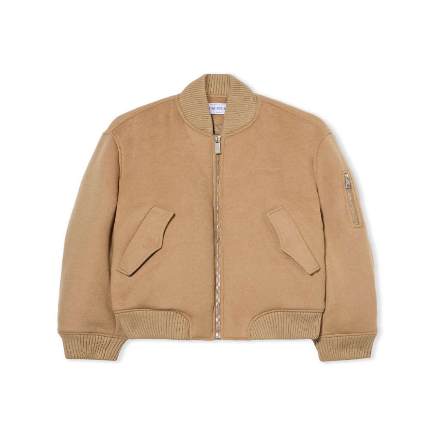 Wool-blend bomber jacket featuring ribbed knit trims and rear text detail.