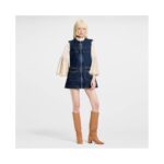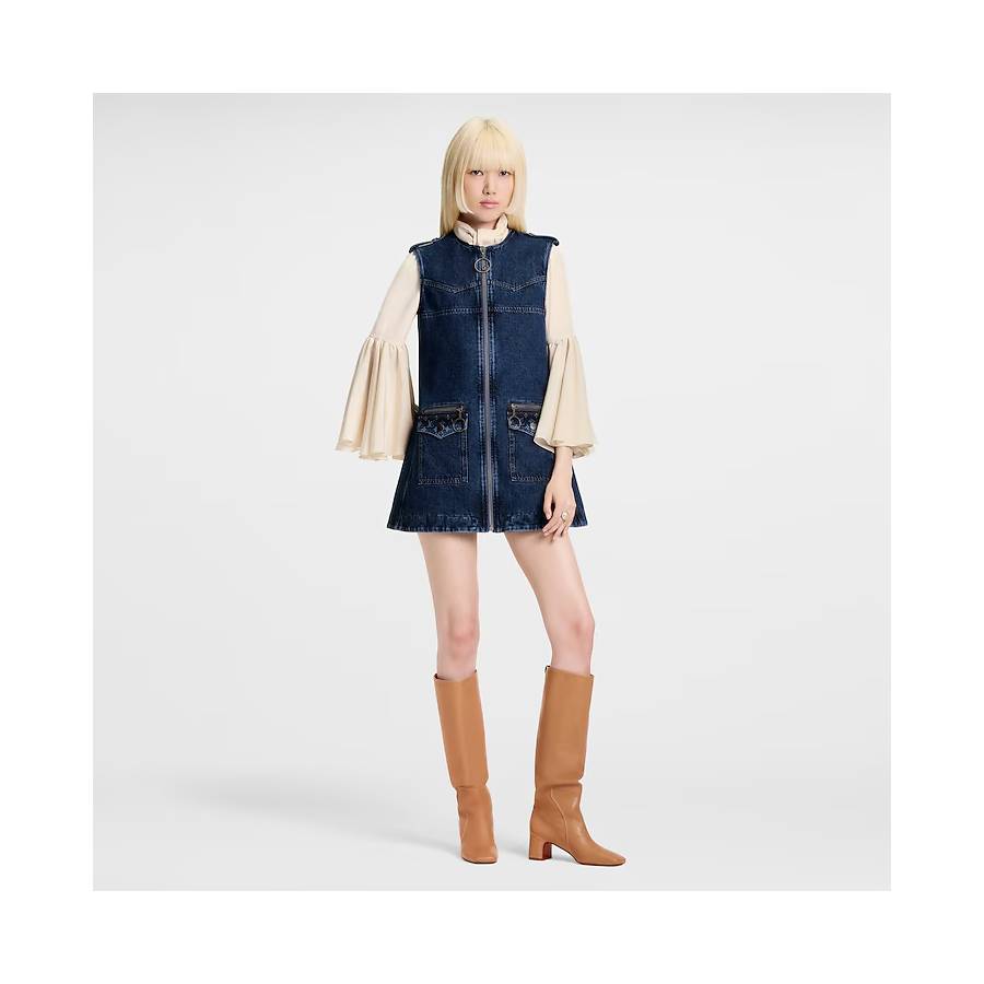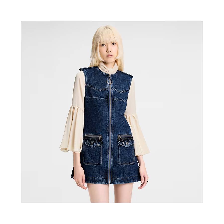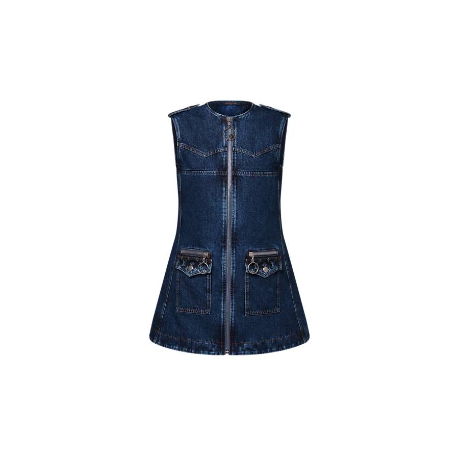 Structured details rework this casual mini dress with elevated appeal. It is crafted from raw denim with topstitching highlighting the construction, including an angular insert across the chest and back. Epaulettes introduce a uniform feel, while multiple pockets nod to utility styles. Monogram accents and an LV Gravity zipper pull complete the look with a subtle signature.