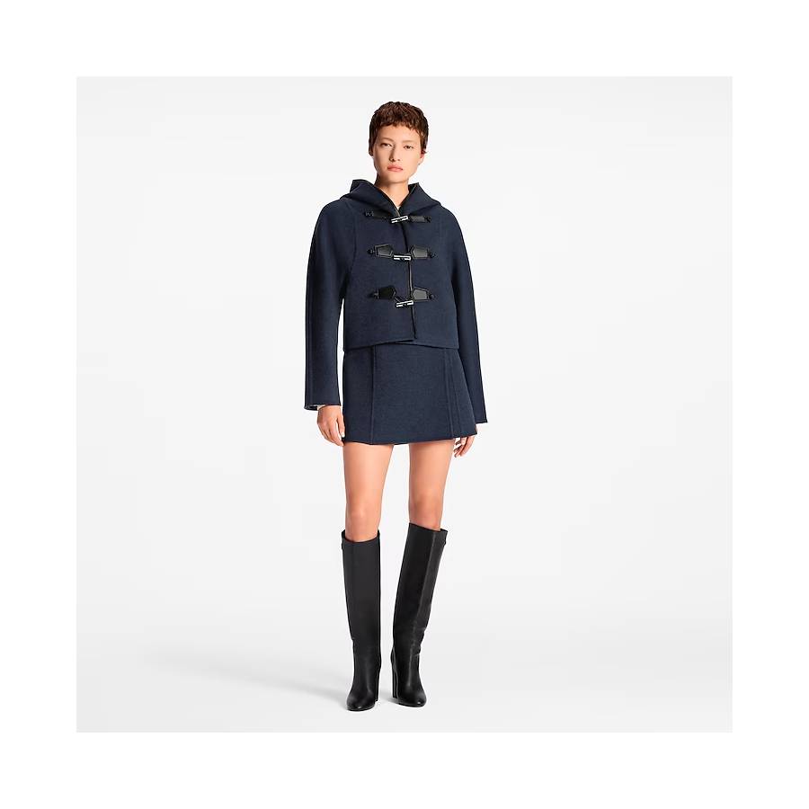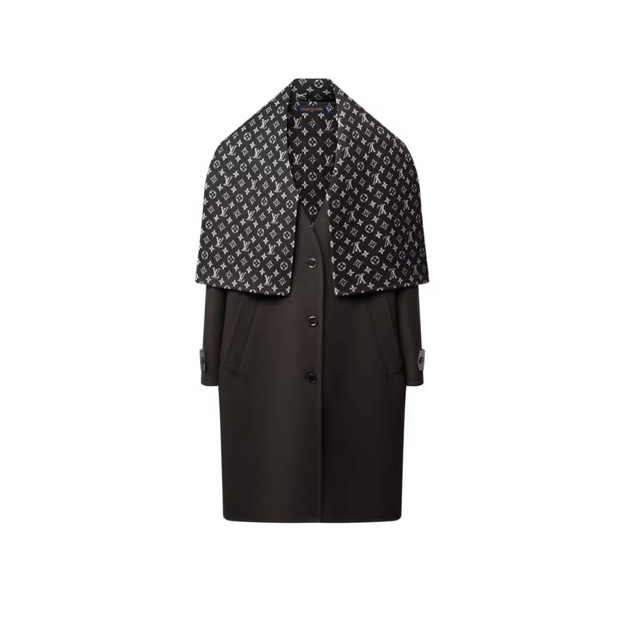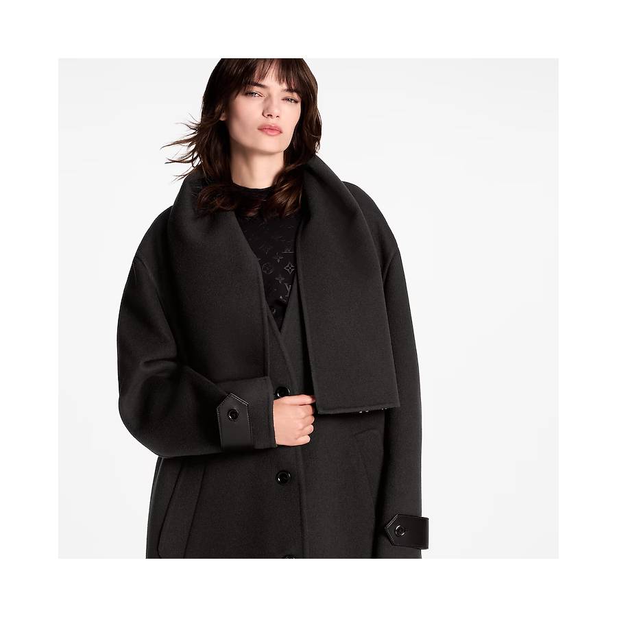 This coat is a versatile cold-weather classic in a long, loose silhouette cut from a plush double-face wool-silk blend with a graphic Monogram jacquard on the inside. The sharp V-neckline is fitted with a removable oversized scarf collar for added coziness, while the cuffs are trimmed with sleek leather tabs for a sophisticated finish.