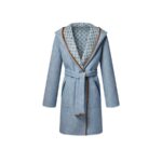 The House’s signature wrap coat envelops the silhouette in a generous long, hooded shape cut from a cozy double-face wool-silk blend. One side is finished with a playful denim effect, while the reverse is signed with a Monogram jacquard. A contrasting leather trim refines the finish, while a casual self-tie belt adds definition to the waistline.