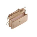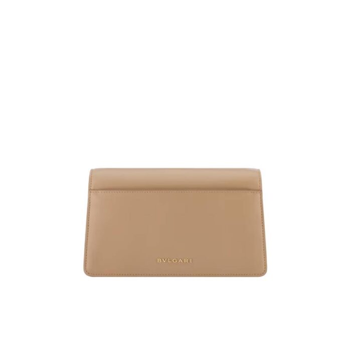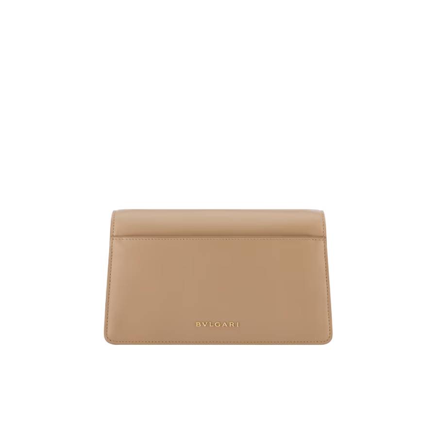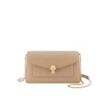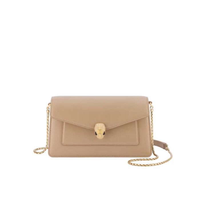 Serpenti Forever small crossbody bag in Travertine calf leather with Travertine nappa leather lining. Captivating snakehead magnetic closure in gold-plated brass embellished with beige noisette enamel and gold-plated brass scales, and black onyx eyes.