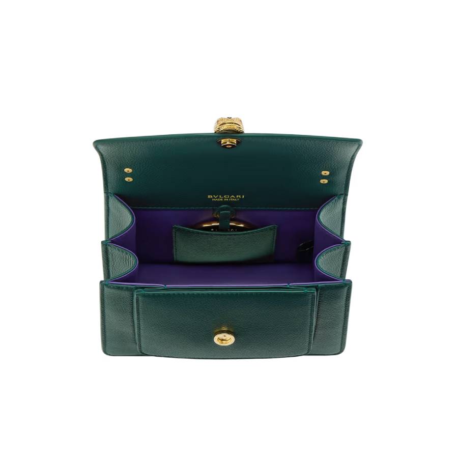Capturing the essence of modern everyday sophistication, the Serpenti Forever Maxi Chain small crossbody bag in Forest Emerald green grainy calf leather is topped by the heritage snakehead magnetic closure, embellished with gemstones, which draws inspiration from a Bvlgari watch from the 1960s. Embodying the bold spirit of the Maison’s jewellery, a chain, which also serves as a handle, hangs over the flap like a necklace. Endowed with a leather strap and a single compartment, the model is complete with a front pocket, a patch pocket on the back, a mirror pocket with a customisable mirror and the Bvlgari metal logo on the back. 19.5 x 15 x 8.5 cm – 7.7 x 5.9 x 3.4 inches. Made in Italy.