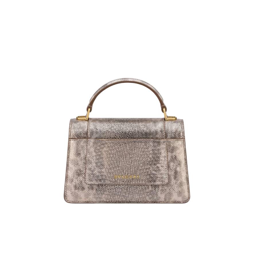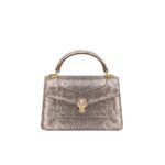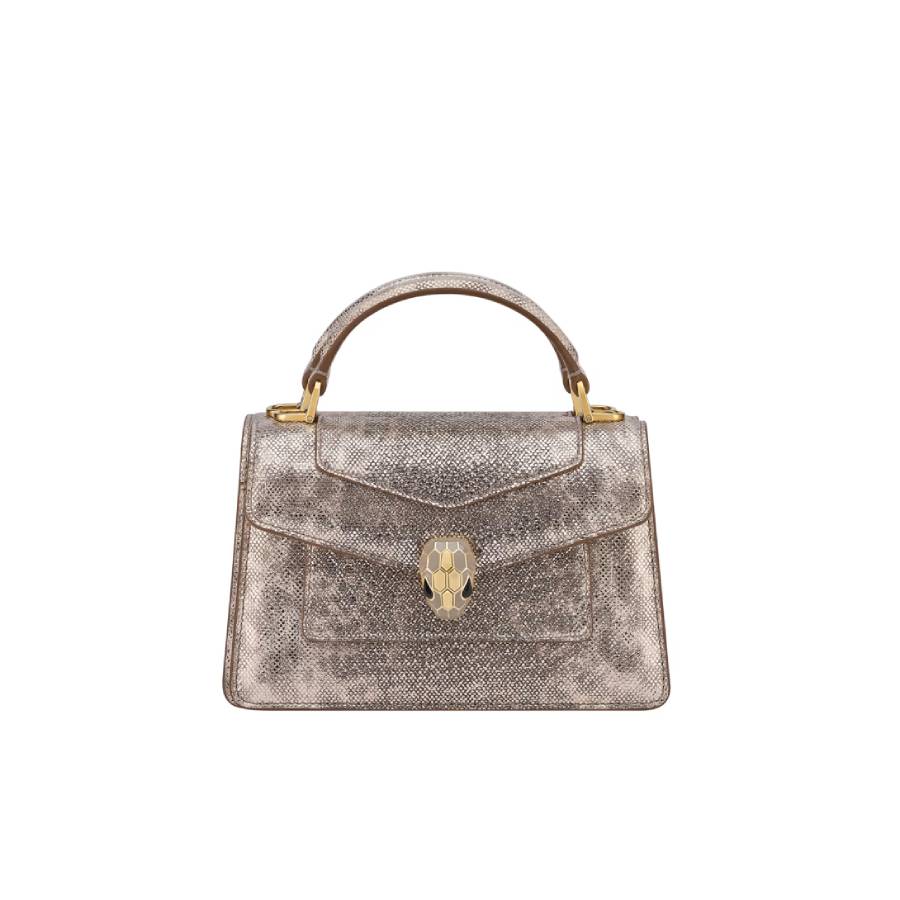 Serpenti Forever mini top handle bag in feroza turquoise Pure karung leather with feroza turquoise nappa leather lining. Captivating snakehead magnetic closure in gold-plated brass embellished with feroza turquoise enamel and gold-plated brass scales, and black onyx eyes.