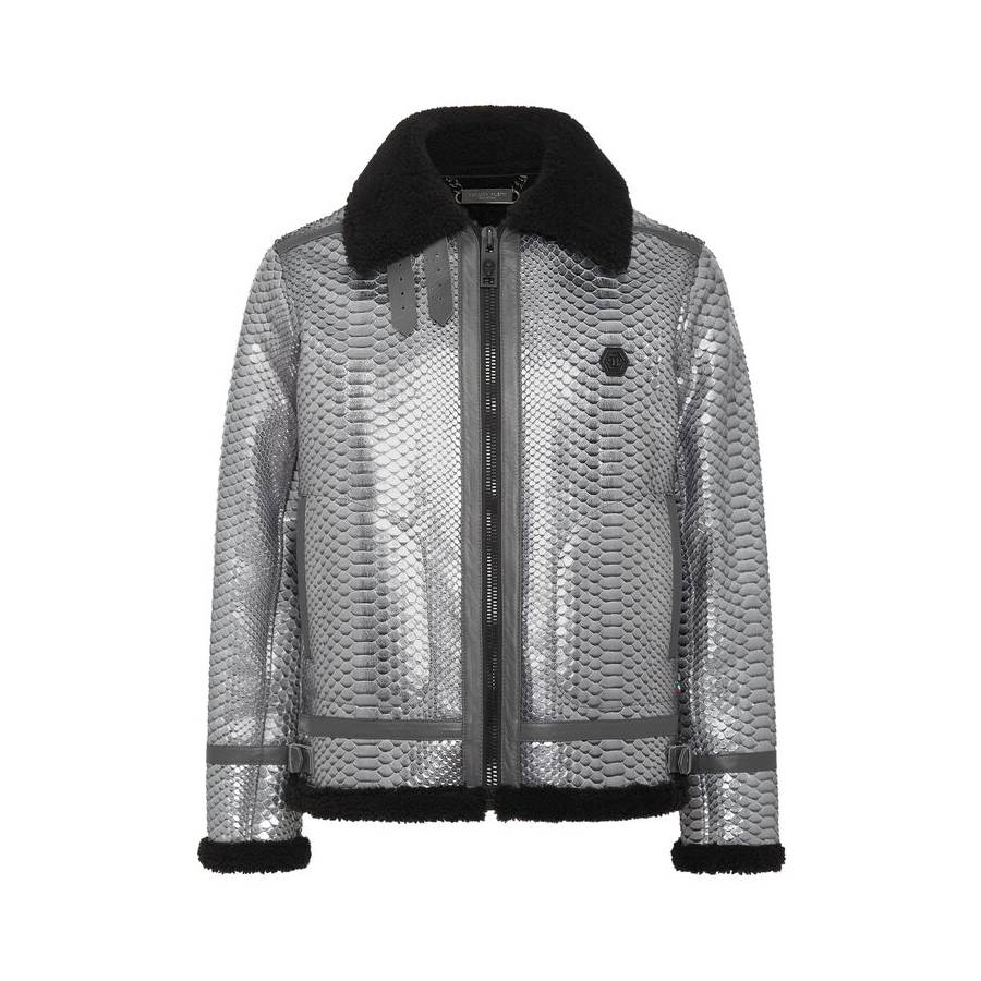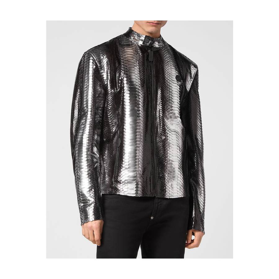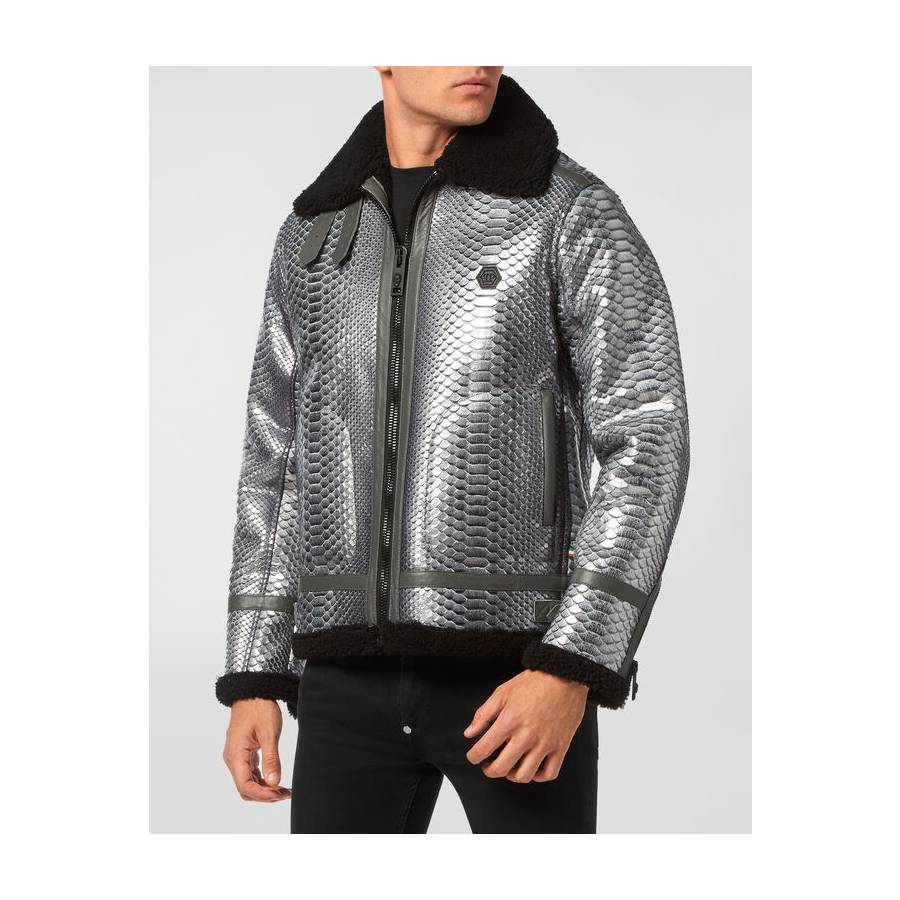 An unapologetic fusion of wild texture and elevated craftsmanship — this jacket pairs exotic python leather with plush shearling for a look that commands the spotlight in any season.