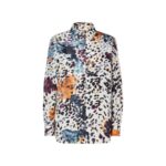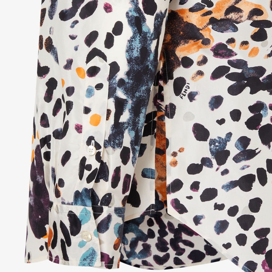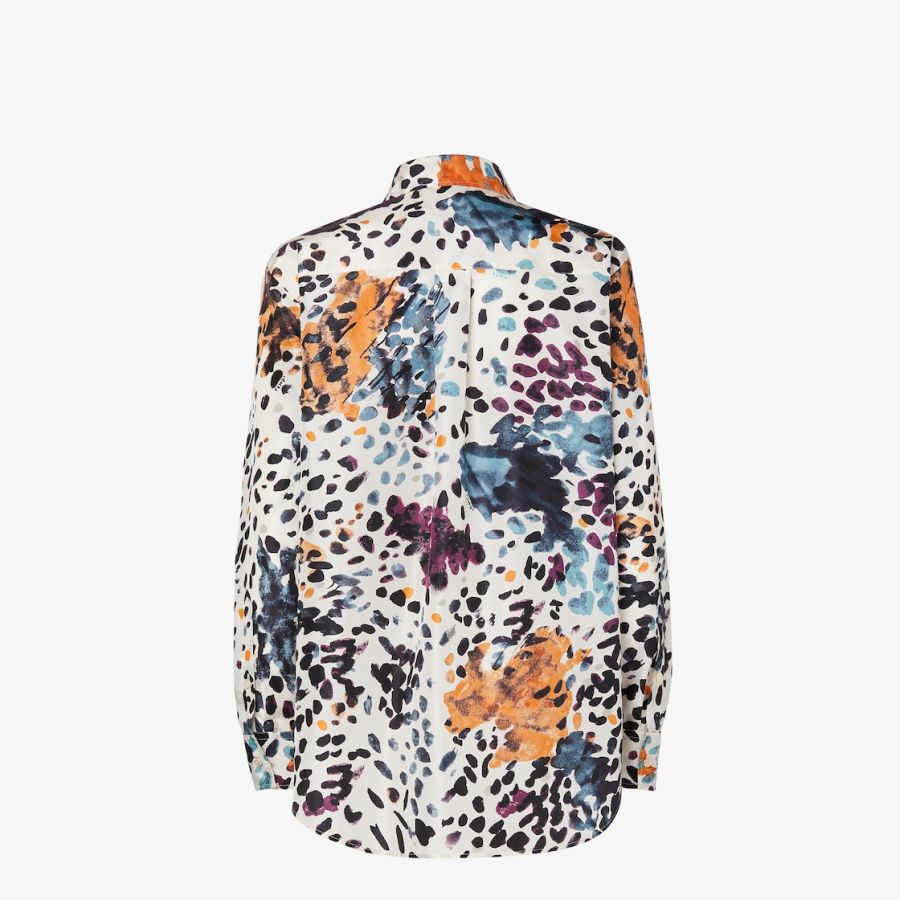 Oversized classic shirt. Long sleeves with dropped shoulders and shirt cuffs. Rounded asymmetric hem. Concealed button fastening. Made of white silk taffeta with all-over Falena print in shades of black and orange.