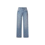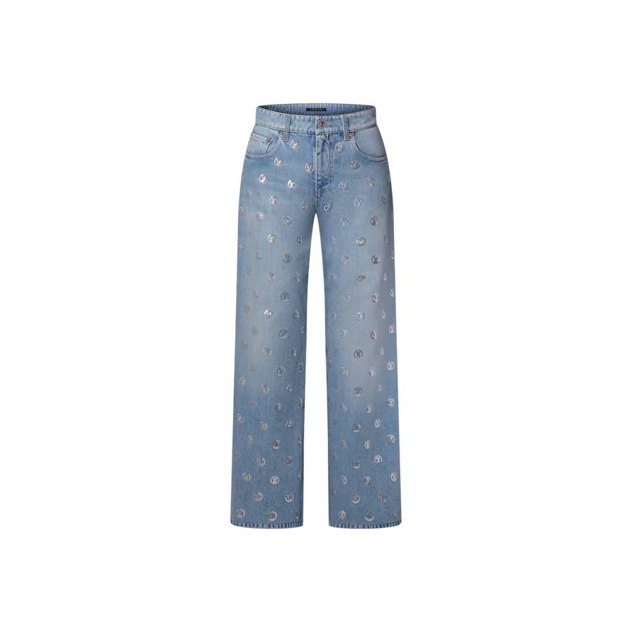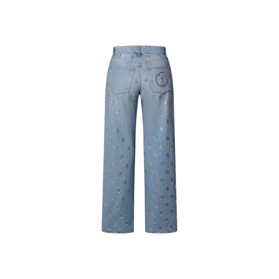 Chic seasonal details playfully reimagine these staple jeans. They are casual and comfortable in classic raw-blue denim cut in a relaxed high-waisted boot-cut shape. They are embellished all over with shimmering sequined LV Circle details, complete with an oversized signature on the right back pocket.