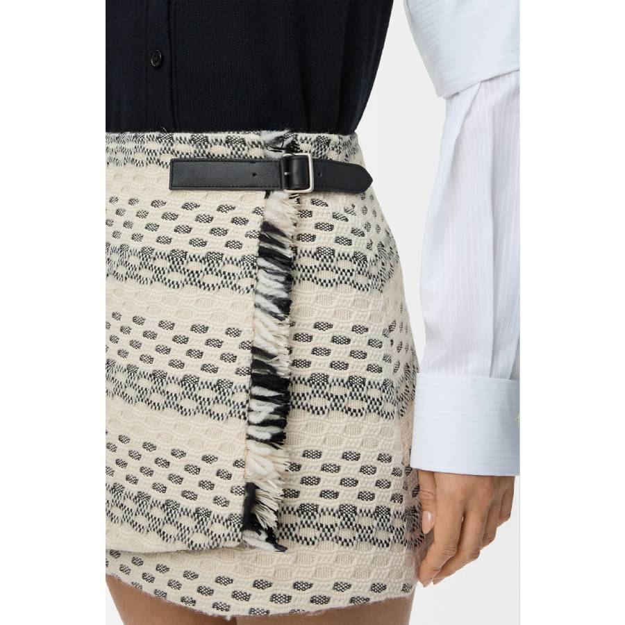 Skirt in medium-weight wool blend jacquard inspired by Anni Albers’s “Fringes” tapestry featuring a wrap construction with a leather belt detail and fringes at the front. This skirt is part of the LOEWE x Albers collection.