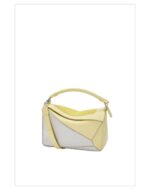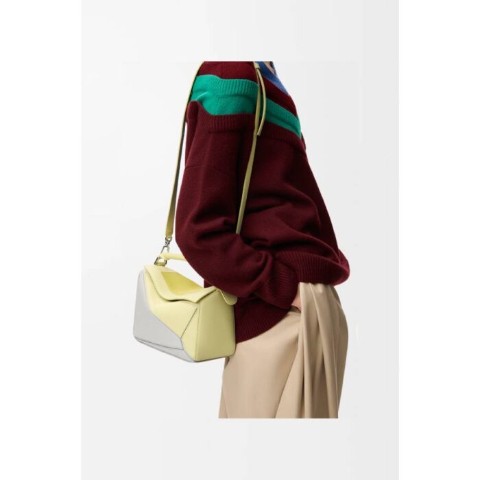 The Puzzle is defined by its distinctive geometric lines and its cuboid form. This small version is crafted in nappa calfskin with intarsio squares inspired by Josef Albers’s “Homage to the Square” series. This bag is part of the LOEWE x Albers collection.