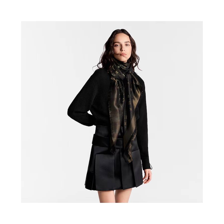 The So Shine Monogram Shawl is crafted from a combination of metallic yarns and silk, giving it a subtly shiny look. This shimmering silk-blend piece features the instantly recognisable Monogram pattern and woven Louis Vuitton signature. It is a luxurious option that can easily transition from day to night.
