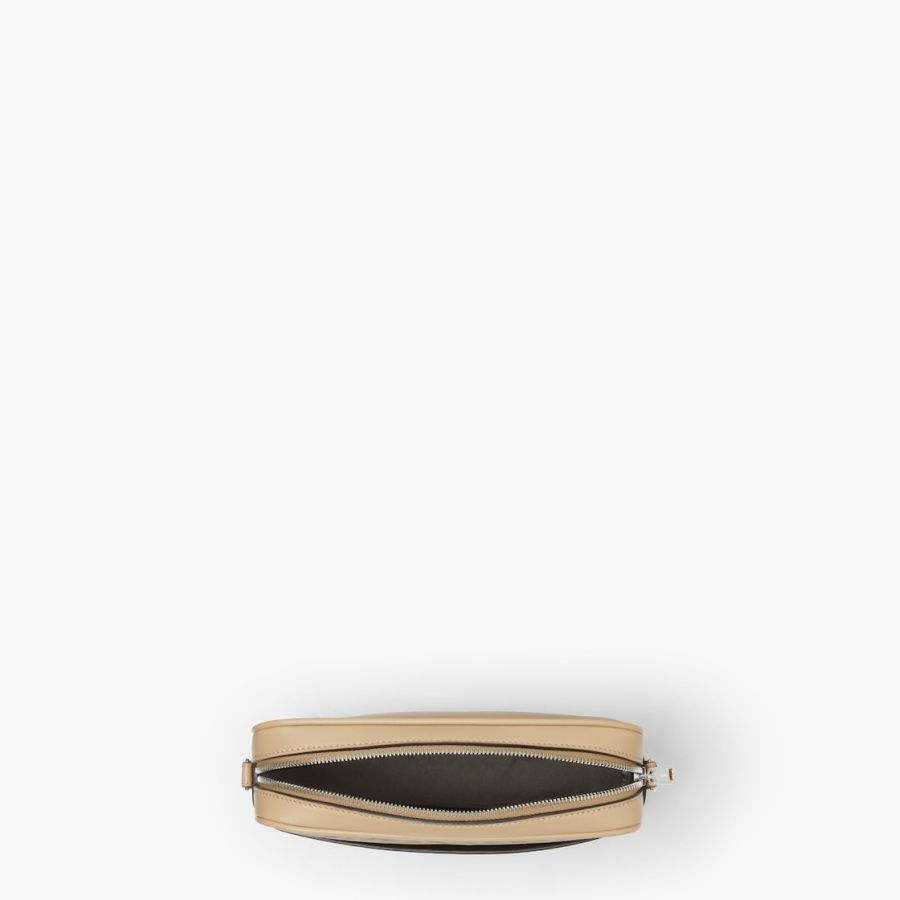Compact shoulder bag made of beige smooth leather and beige FF Canvas. Decorated with FF metal appliqué.