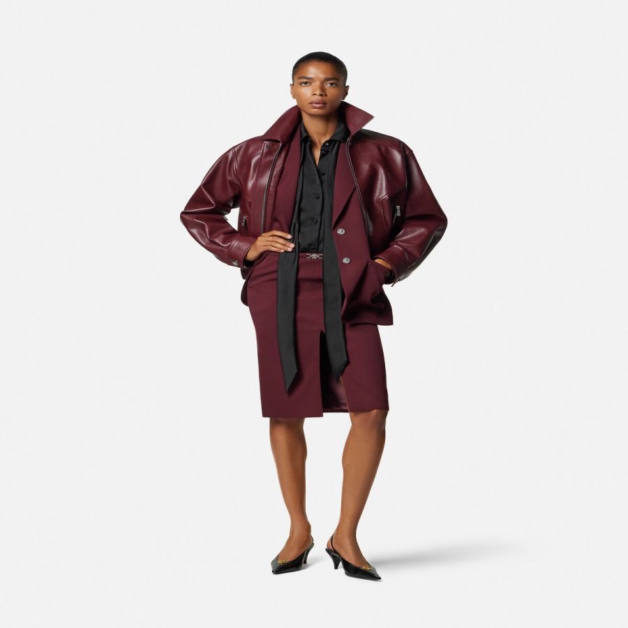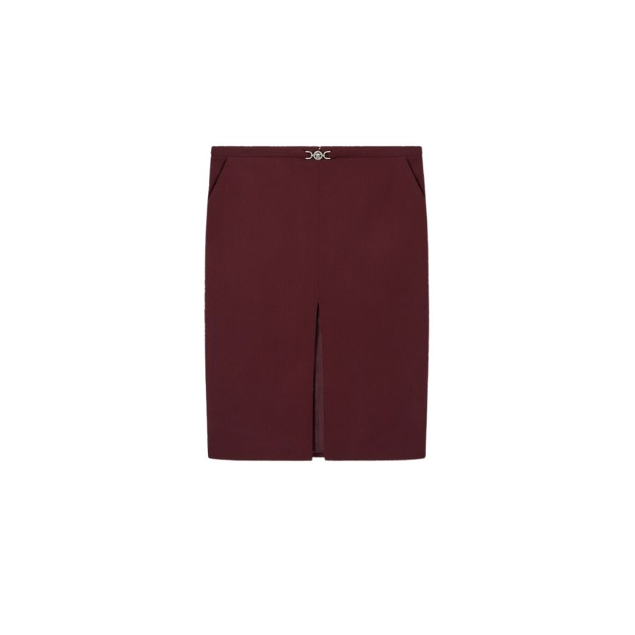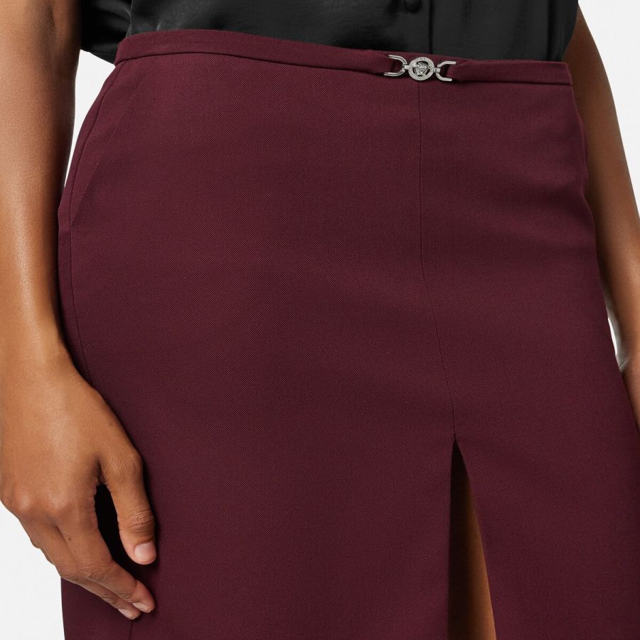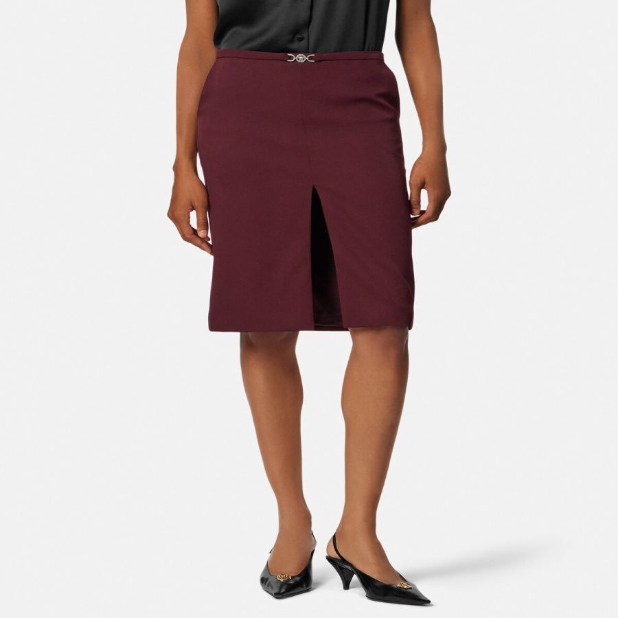A fitted pencil midi skirt in stretch gabardine featuring a Medusa ’95 hardware at the waistband and a front split.