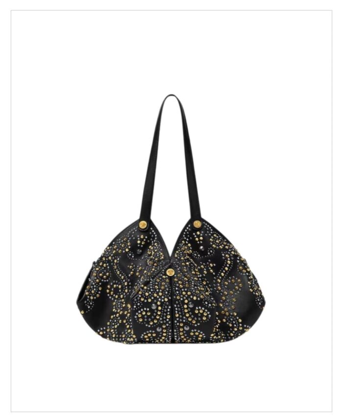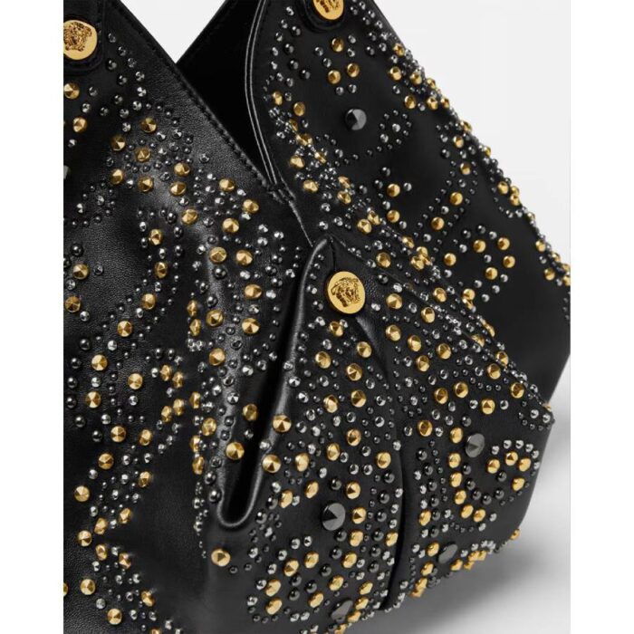 The Protea shoulder bag is crafted from supple plongé nappa leather. Inspired by the changing nature of its namesake tropical flower, it features a unique magnetic fold closure that transforms for added versatility. The spacious design is accented with stud embellishments and metal rivets featuring the Medusa emblem at each corner. The circular base is finished with a subtle embossed Medusa.