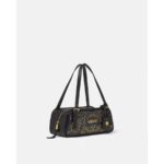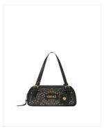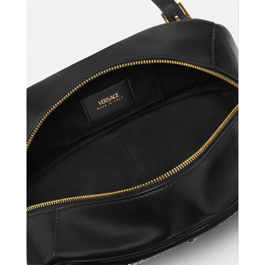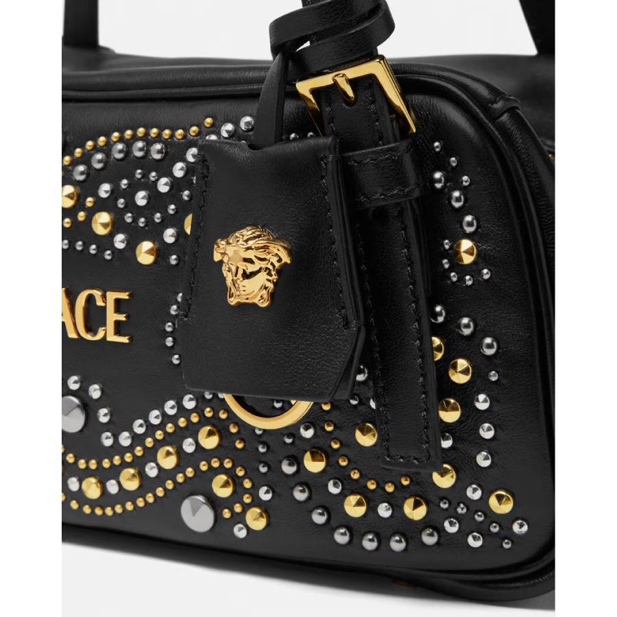 The Versace Tag bowling shoulder bag is crafted from ultra-soft nappa leather and features stud embellishments throughout. The versatile accessory is accented by metal Versace Logo lettering and can easily be carried over the shoulder or in-hand by the adjustable leather handles. A removable leather tag keychain with Medusa hardware completes the design.