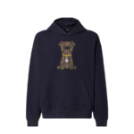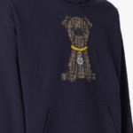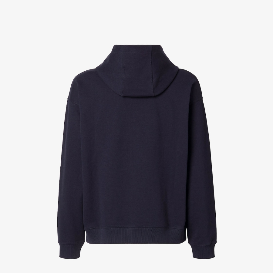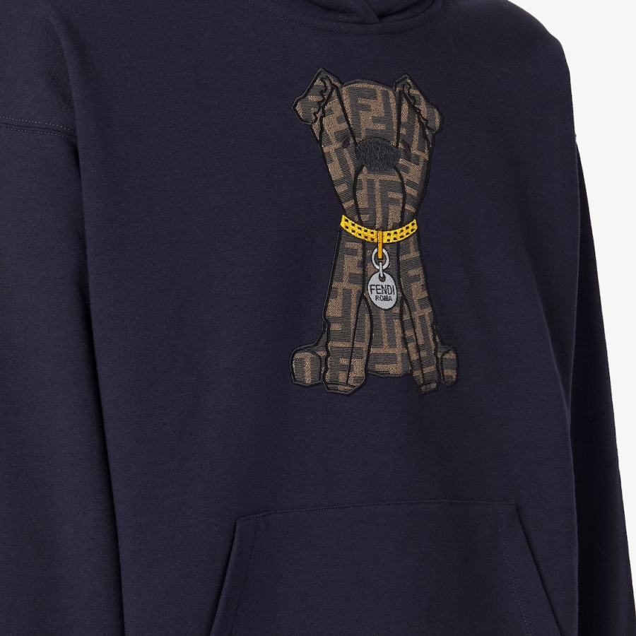 Long-sleeved sweatshirt with drawstring hood. Pouch pocket at the front. Made of 100% cotton in dark blue. Customised with a large, brown FF Jacquard patch inspired by Creative Director Silvia Venturini Fendi’s dog Ito.