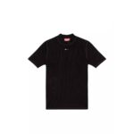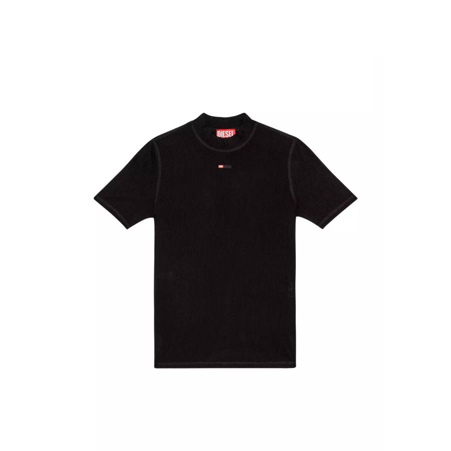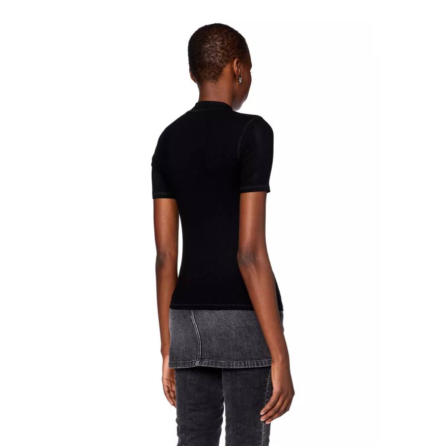Womens T-shirt built from stretch rib jersey, containing Ecovero viscose fibres. Styled with a skinny fit and mock neck, its embroidered with a micro D initial on the front.