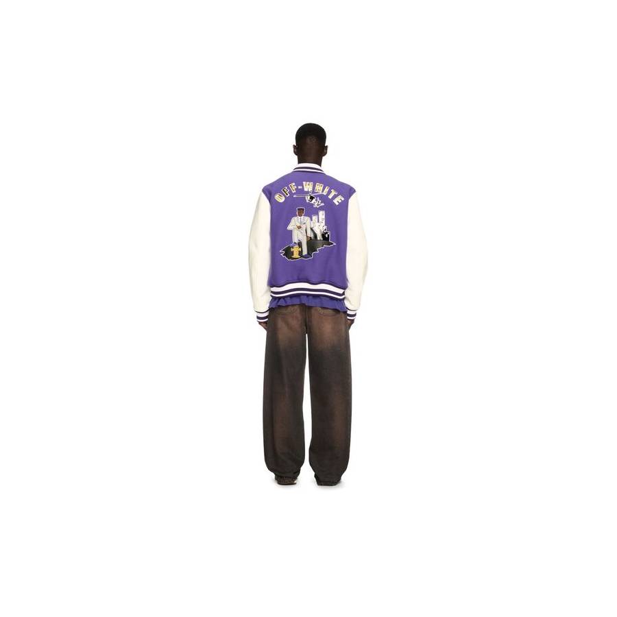This lined varsity jacket is crafted from a wool-blend with 100% leather sleeves. It features multiple patch logos with gold accents on the front and a large graphic on the reverse with a businessman, cityscape and helicopter. Made in Italy.