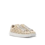 The emblematic Time Out sneaker is revisited in cashgora, a luxuriously soft wool fabric woven with the Monogram pattern. This model is complemented by refined details, including engraved, gold-toned eyelets and calf-leather trim at the back bearing the Louis Vuitton signature. Its elevated outsole in lightweight EVA is decorated with three Monogram Flowers.