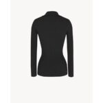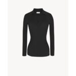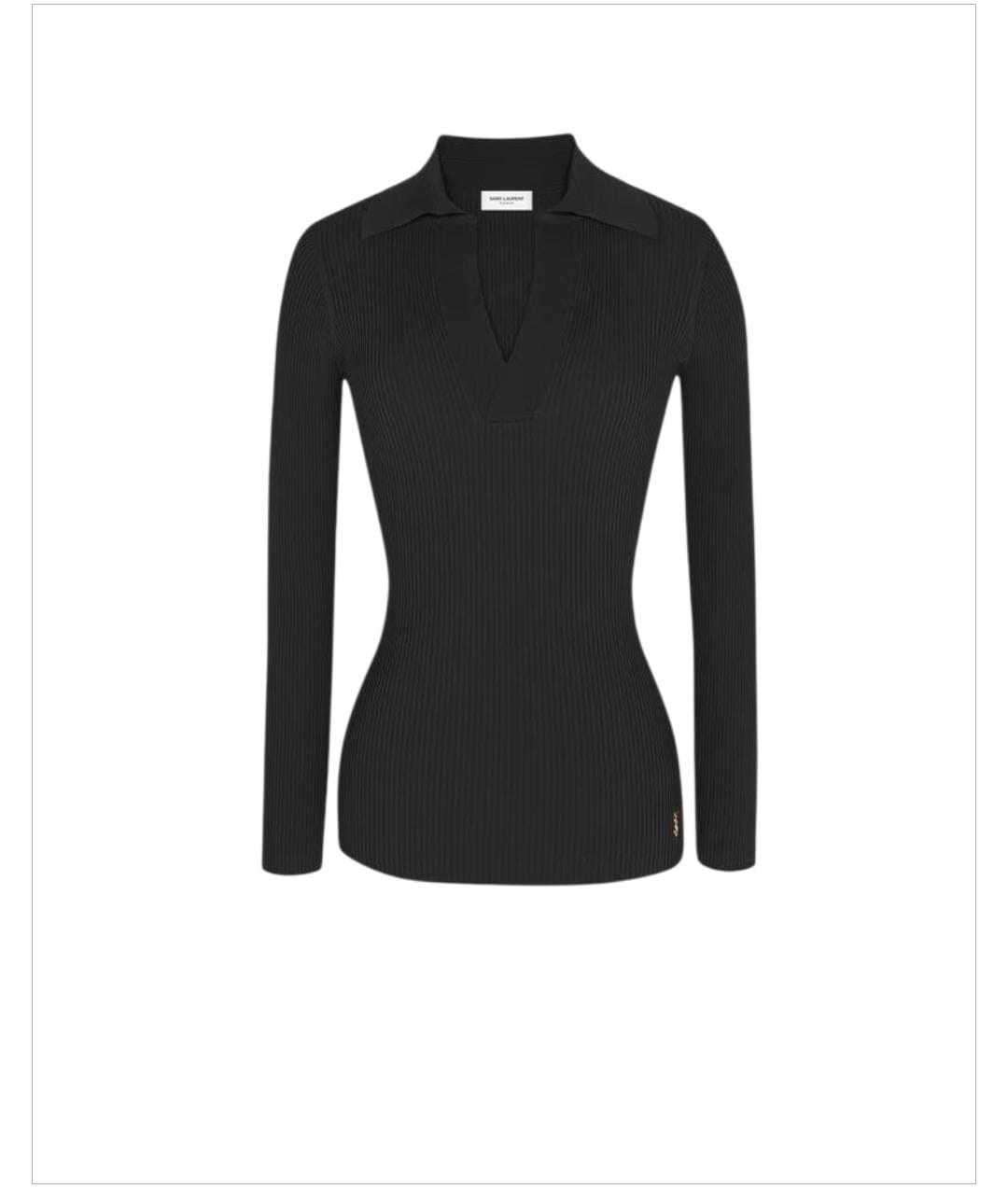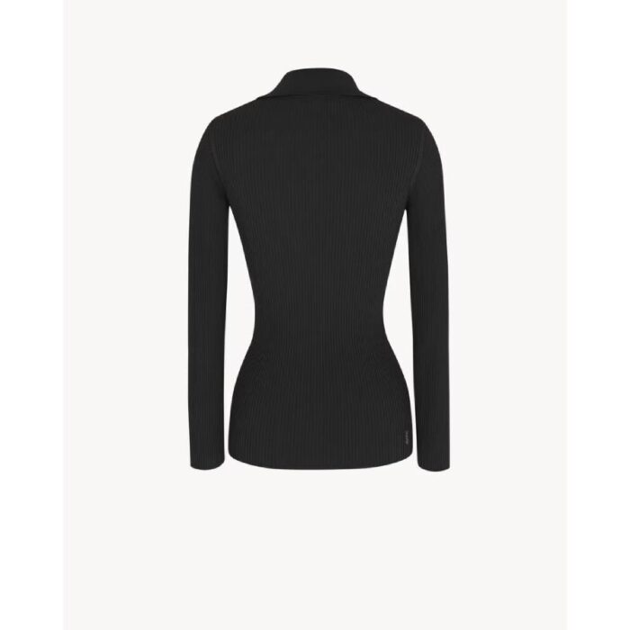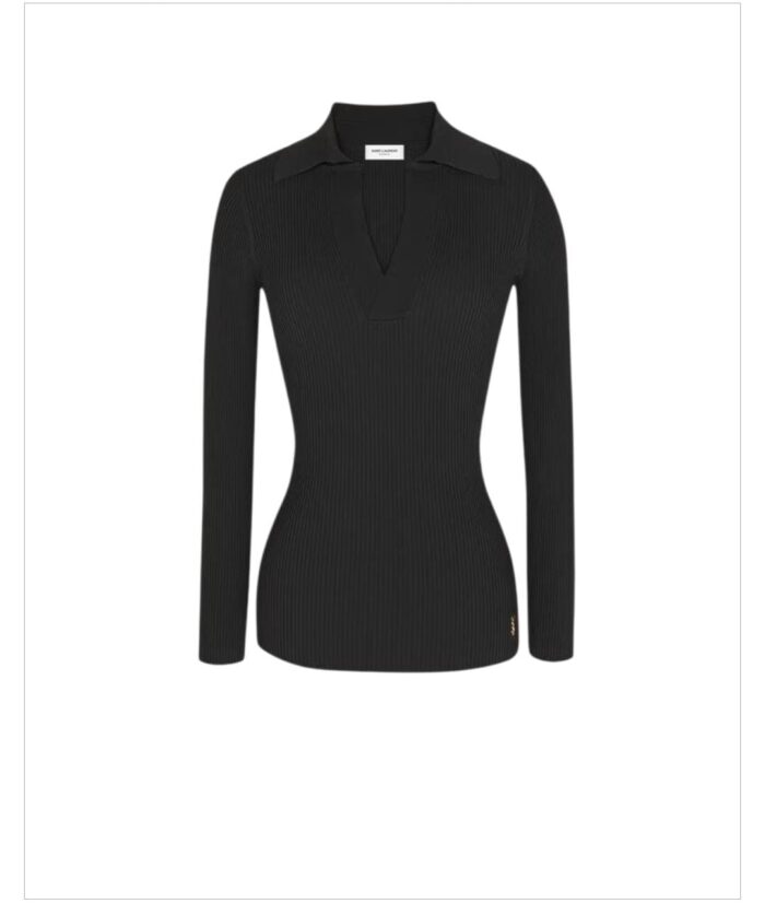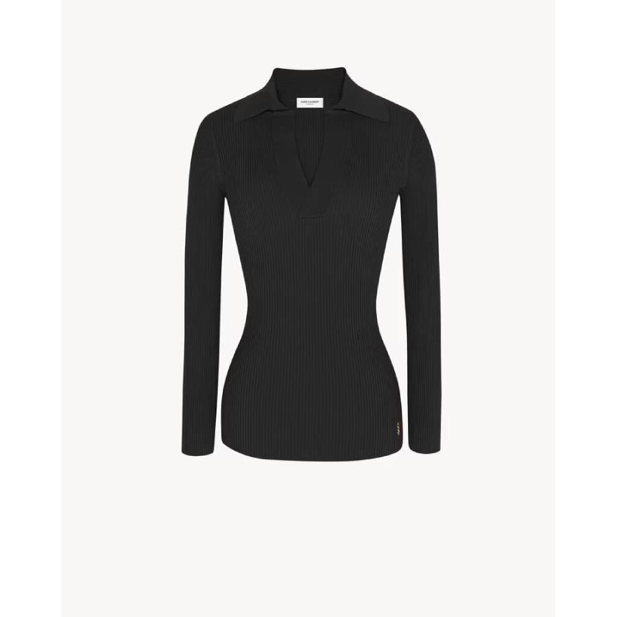 Long-sleeved top made with certified viscose, with v-neck featuring pointed collar, with all-over ribbing and metal Cassandre on the hem.