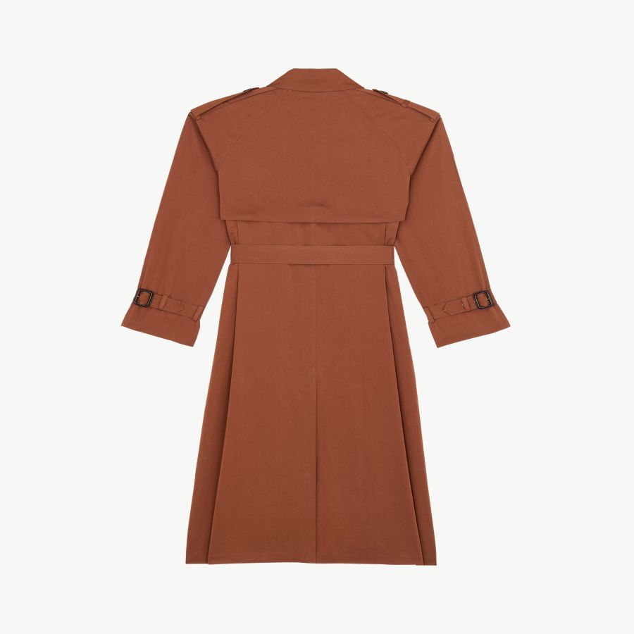 oversized double-breasted belted trench coat with a three-way ulster collar and adjustable throat latch, featuring a storm flap, buttoned epaulets, and strapped cuffs.