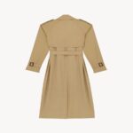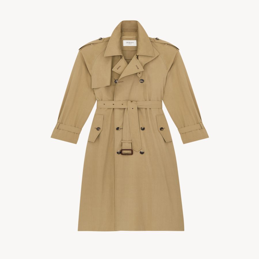 oversized double-breasted belted trench coat with a three-way ulster collar and adjustable throat latch, featuring a storm flap, buttoned epaulets, and strapped cuffs.