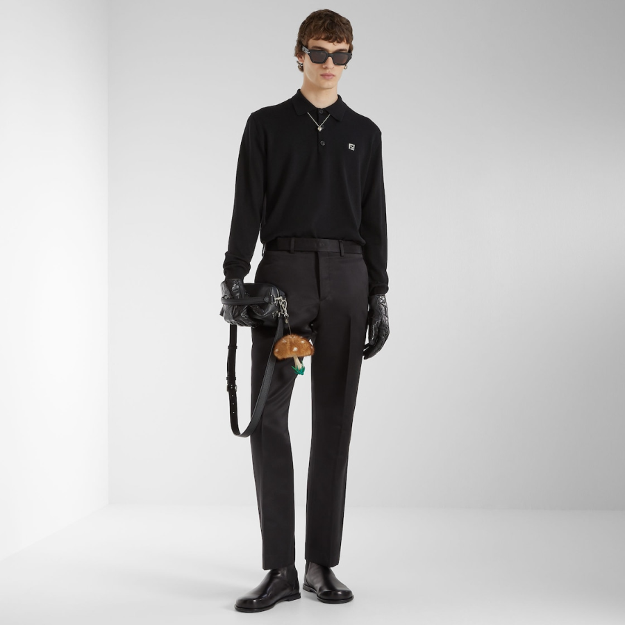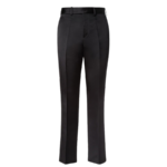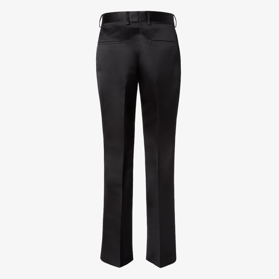 Trousers with flare at the ankle. Belt loops on the waistband and trouser crease. Concealed zip and hook fastening. Made of black duchess silk.