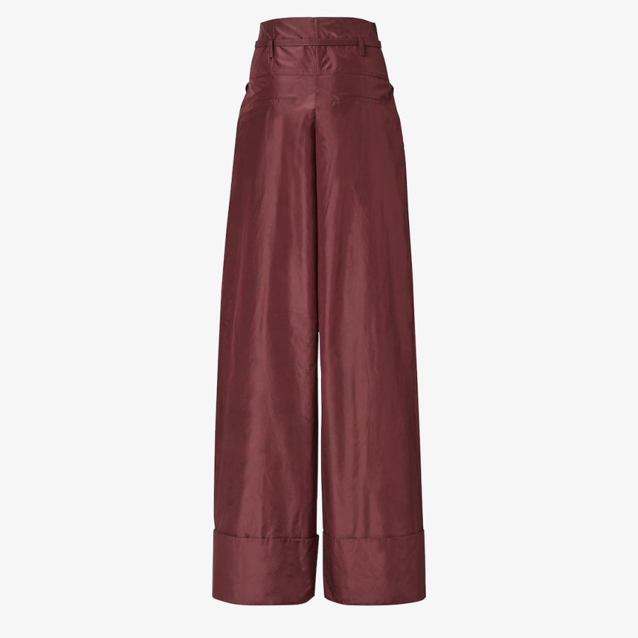 High-waisted trousers with yoke detail and pleats on the front. Side pockets and wide, turned-up hem. Matching belt loops and belt with metal FF buckle at the waist. Concealed zip fastening. Made of burgundy silk taffeta. Palladium-finish metalware.