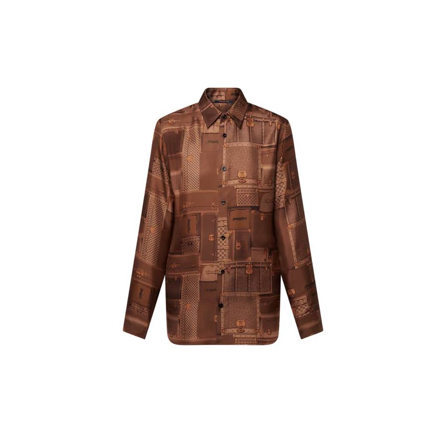 This shirt makes a sophisticated statement in this season’s signature print of archival Louis Vuitton travel trunks in the House’s timeless colorway. Crafted from soft, fluid silk twill, it is tailored in a loose, straight shape with a smart collar, fastened cuffs and a button front for versatile styling.