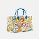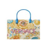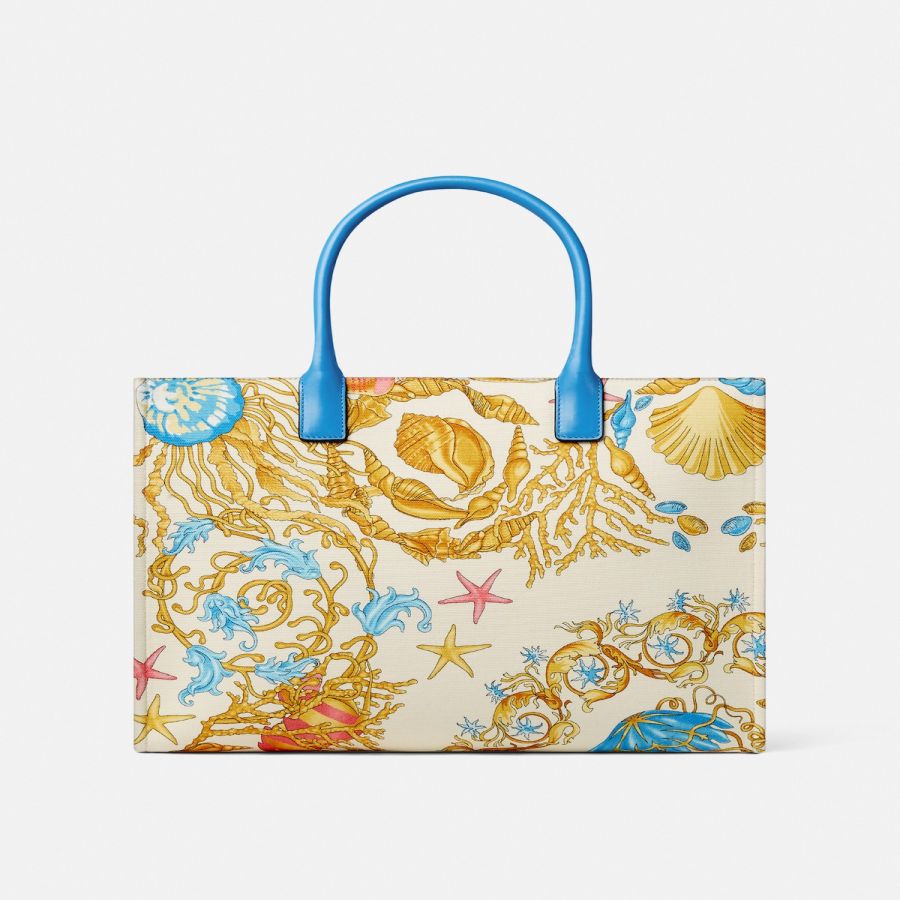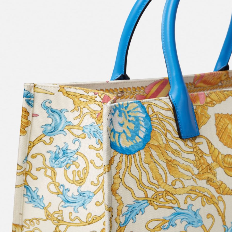 Crafted from canvas with leather top handles, this spacious tote bag features an Underwater Barocco print and is detailed with a front La Medusa hardware. It showcases a leather raised Versace Logo lettering, two zipped pockets, and a leather protector strap. The front D-ring provides an optional attachment for a keychain or charm.