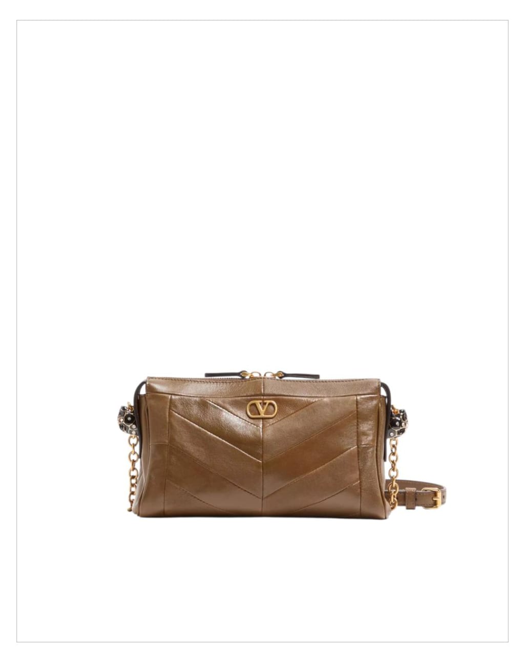 Valentino Garavani Panthea small shoulder bag with patchwork in shiny and matte nappa leather with a chevron pattern. The bag features enameled feline heads adorned with Swarovski® crystals. The bag can be worn over the shoulder or crossbody thanks to the shoulder strap.