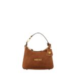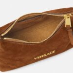 The Versace Tag hobo bag is crafted entirely from suede. The versatile accessory is accented by metal Versace lettering and can easily be carried in-hand by the top handle or crossbody by the detachable and adjustable suede strap. A removable suede tag keychain with Medusa hardware completes the design.