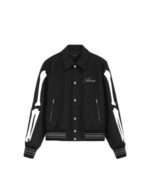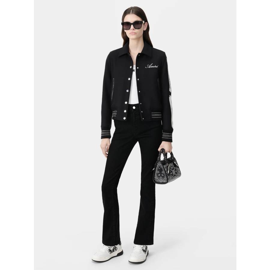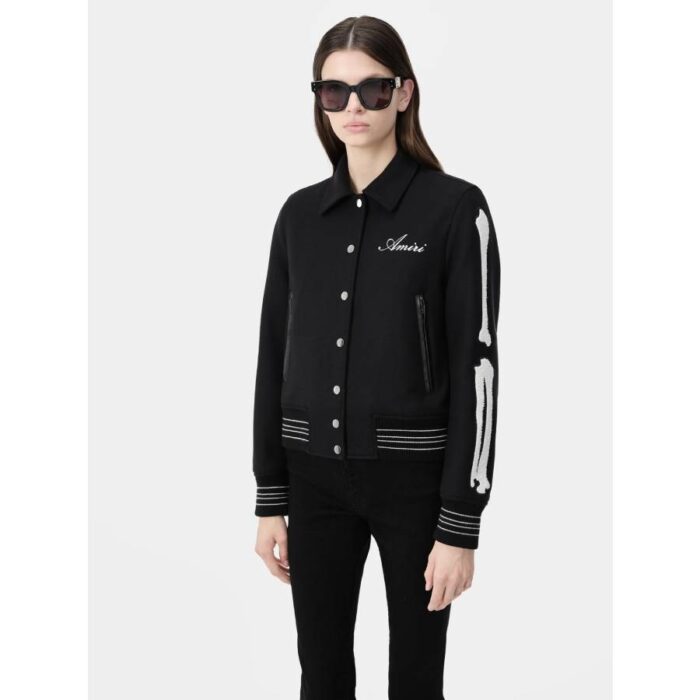 A renegade take on a classic outerwear silhouette emerges as a definitive house icon. The Bones Jacket is crafted in wool with chenille bone appliqué and finished with welt zipper pockets, banded rib accents and classic snap front closure alongside the embroidered AMIRI script logo at chest.