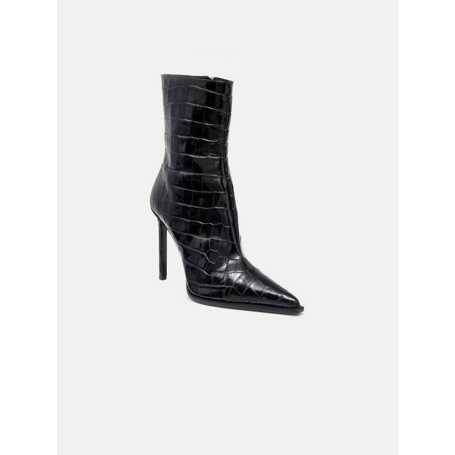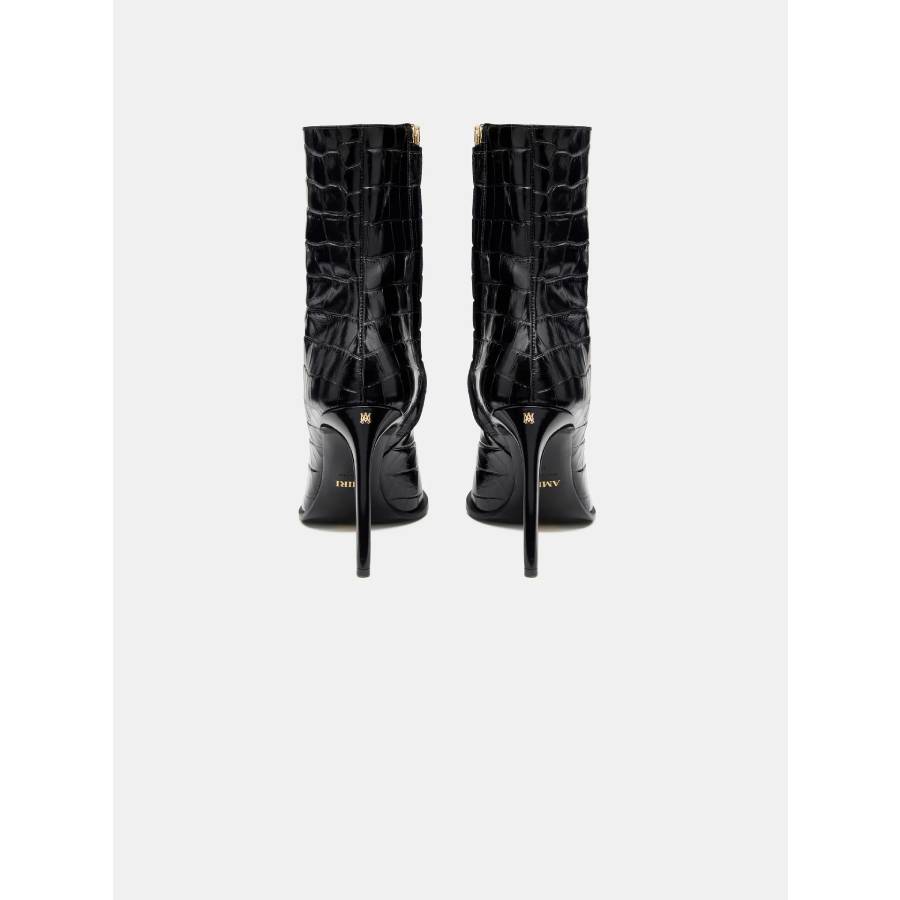 Croc-debossed leather lends tactile edge to women’s footwear for Autumn-Winter 2025. The Croc Debossed MA Stiletto Boot is designed in a pointed-toe silhouette with a straight stiletto heel and side zip closure.