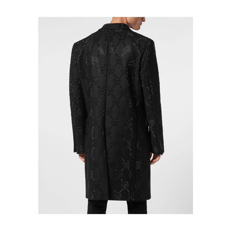 Full round originality. Check out this woolen overcoat featuring pure Plein details.