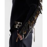 • Embellished with studs, leather fringe, and leather straps with buckles