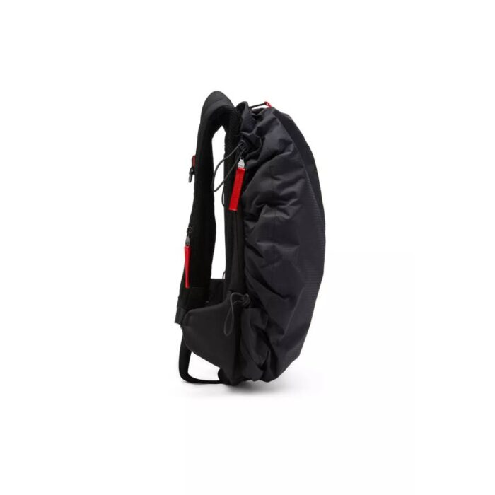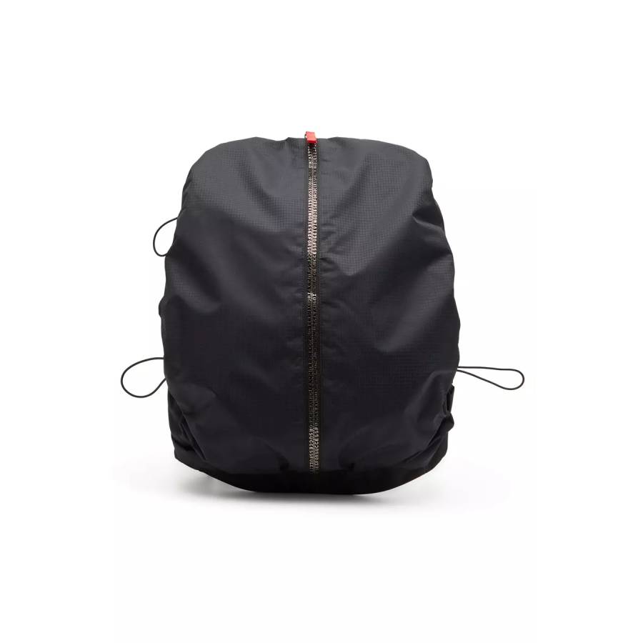Built from check-jacquard shell, this backpack is a unisex accessory infused with cool functional details. It has bungee cords to expand or compress its size, a pocket on one of the shoulder straps, and a chunky front zip thats traced with metal logo lettering all along the length. The contrasting red pulls pop against the all-black design.